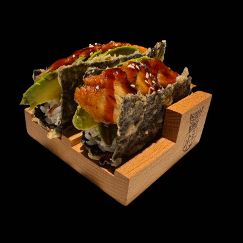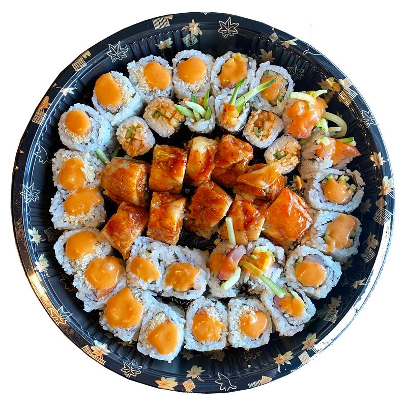 10 pieces of Red Coral Roll, 6 pieces of Spicy Ebi Maki, 8 pieces of Spicy Salmon Roll, 8 pieces of Spicy Tuna Roll, 8 pieces of Crispy Salmon Roll, 8 pieces of Crispy Tuna Roll